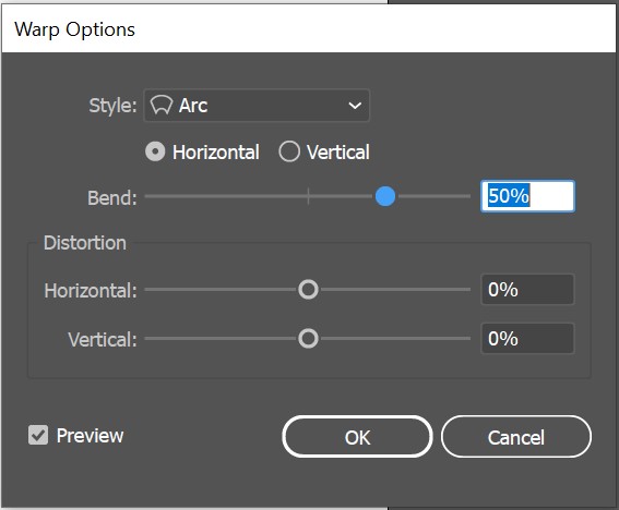 Step 2: Set your desired warp options, including style, horizontal or vertical application, bend amount, and distortion. (The picture below shows the preview of how text looks under different wrap styles)