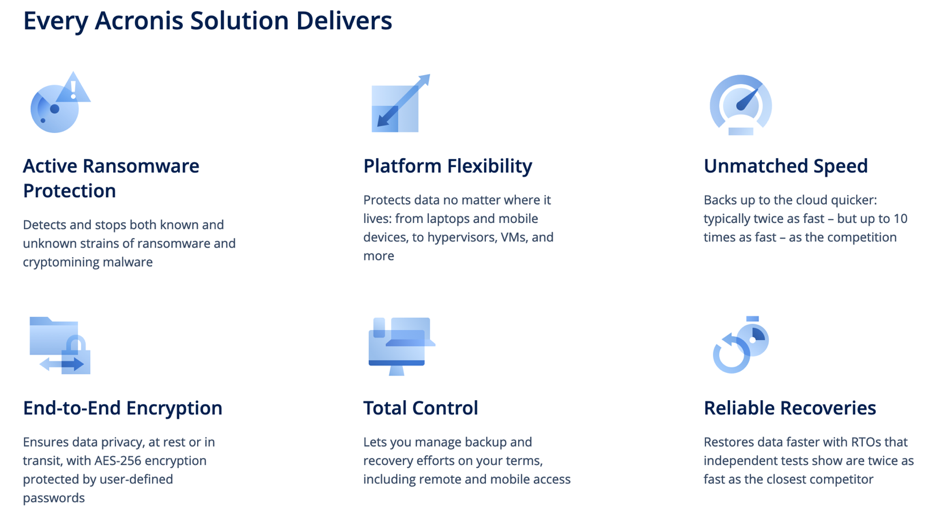 Acronis Backup 12.5 is the world’s easiest and fastest backup solution for all your data, whether it is located on-premises, in remote systems, in private and public clouds, or on mobile devices. With Active ProtectionTM from ransomware, enhanced backup validation, and blockchain-based authentication of your backups with Acronis NotaryTM, Acronis Backup 12.5 is the most reliable backup solution on the market today.